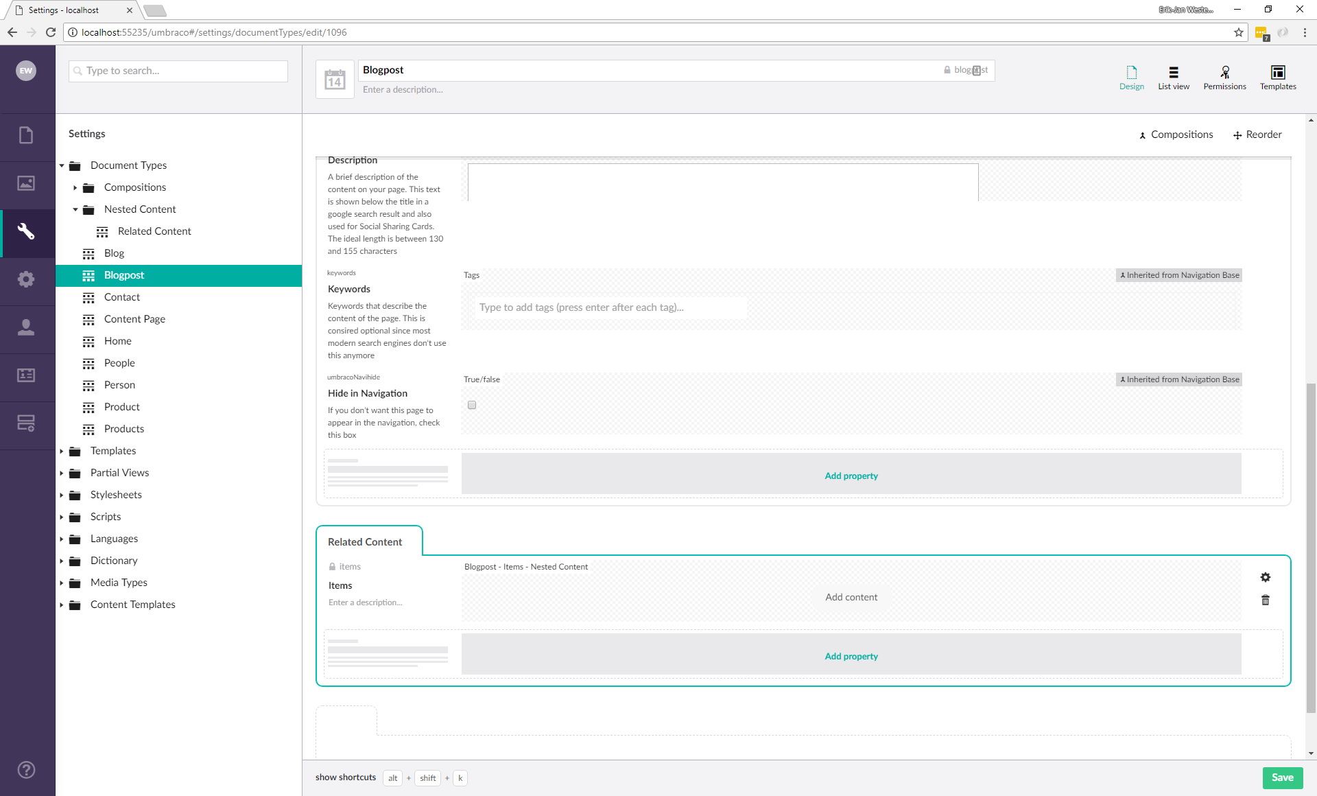 Navigate to the settings section of Umbraco. In this section you can find all of the document types that have been defined. Create a new directory called Nested Content. Once you’ve done that, create a document type and name it “Related content”. Give the document type you have just created the following three properties: