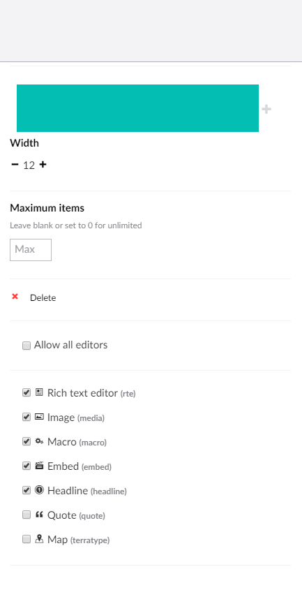 We will create three rows. The first row is one column that spans the full width of the page. We already had a full width configuration, but to make it easier for the content editor, we will simplify the configuration a bit. As you can see in the image below, an editor can use almost any kind of editor. Because of the complaint about the amount of possibilities, we will switch off all types of editors except for the rich text editor.